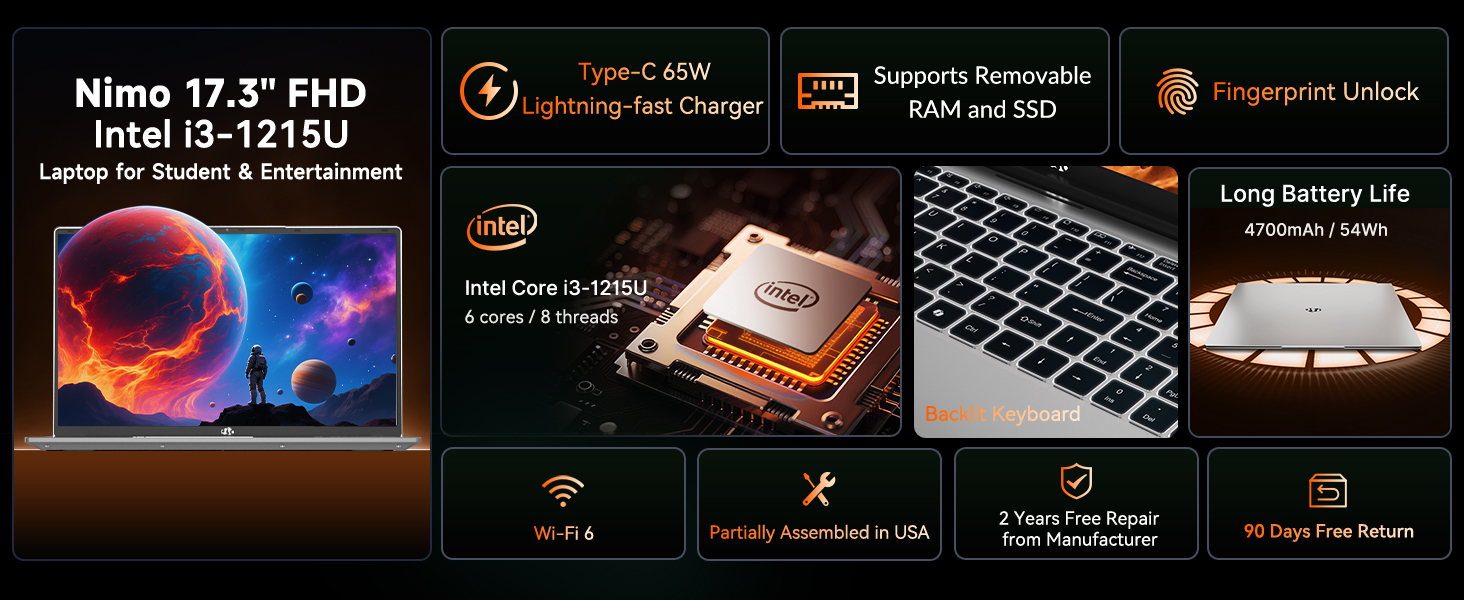 NIMO 17.3″ IPS FHD Laptop, Intel 6 Cores i3-1215U 8GB RAM 128GB SSD (Beat Ryzen 5 7520U, Up to 4.4GHz) Computer with 65W GaN Type C Backlit Keyboard Fingerprint, for Home Student and Business