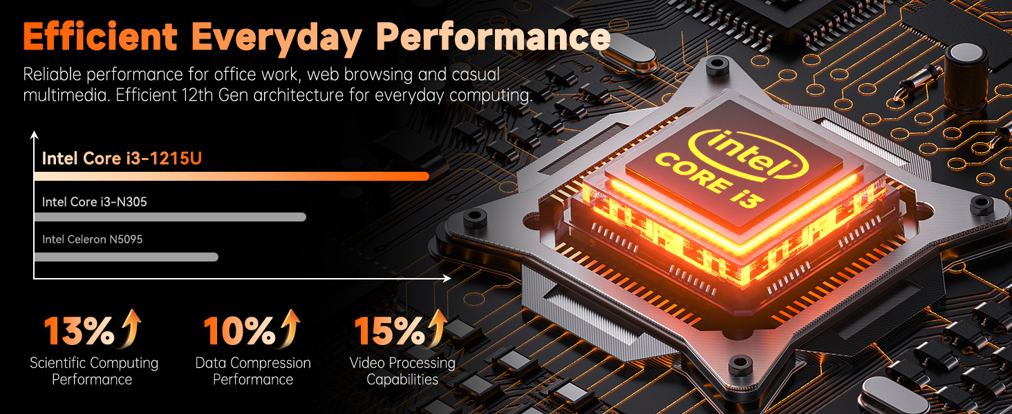 【Intel Core i3-1215U Processor】Experience next-level efficiency with the 12th Gen Intel Core i3-1215U 6-core, 8-thread powerhouse (1.2GHz base, up to 4.4GHz Turbo Boost). Engineered for responsive multitasking and smooth productivity, this processor outperforms Ryzen 7320U, Ryzen 7520U, Anker Lake N150, N200, N305,N97, Celeron 4120, Pentium 5095 and even the I5-1135G7 in speed and efficiency.