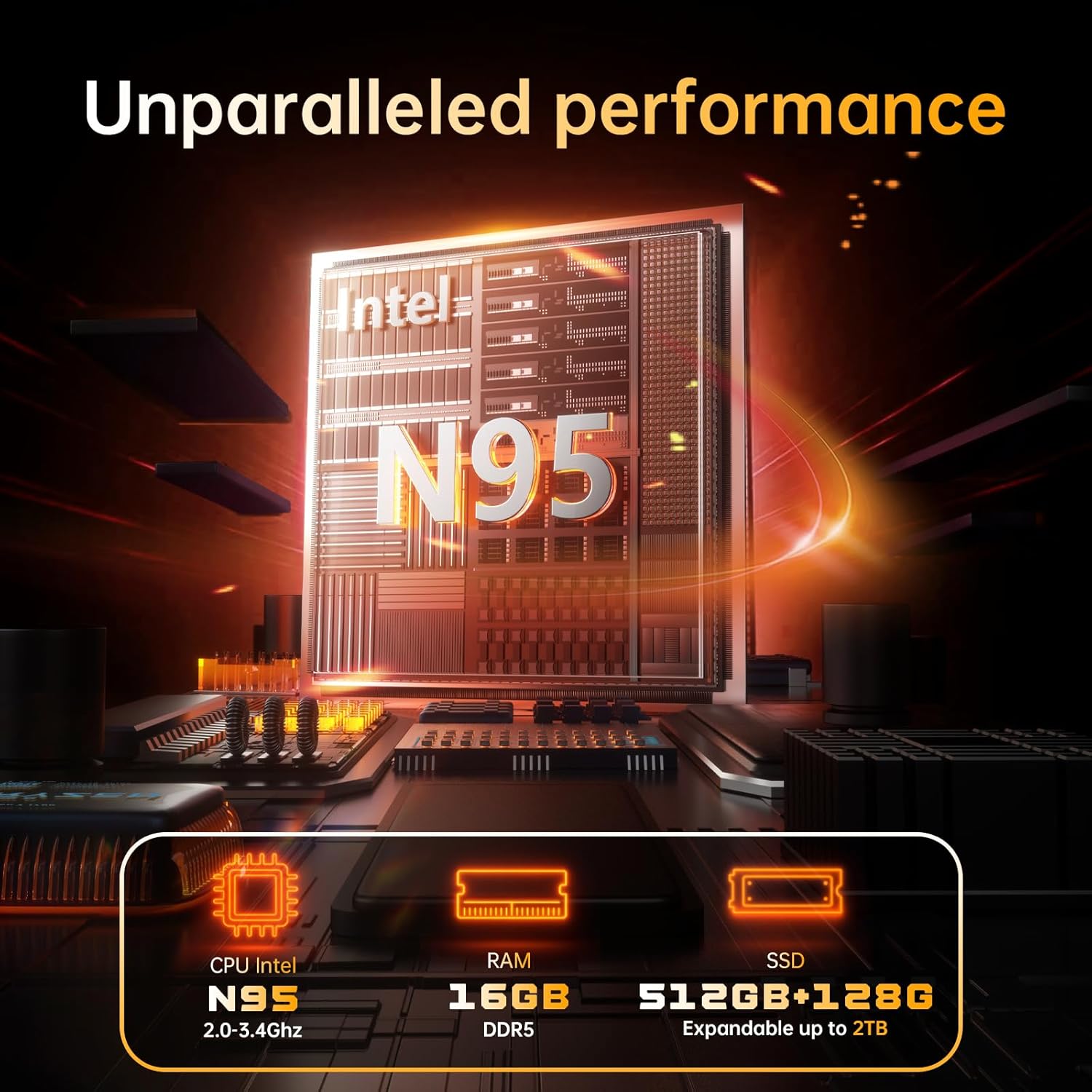 Powerful Performance : Equipped with an Intel N95 Processor (1.7GHz-3.4GHz) and 16GB DDR5 RAM, this laptop ensures smooth multitasking for work and entertainment. It features 640GB storage (512GB SSD + 128GB eMMC), offering plenty of space for files and media.